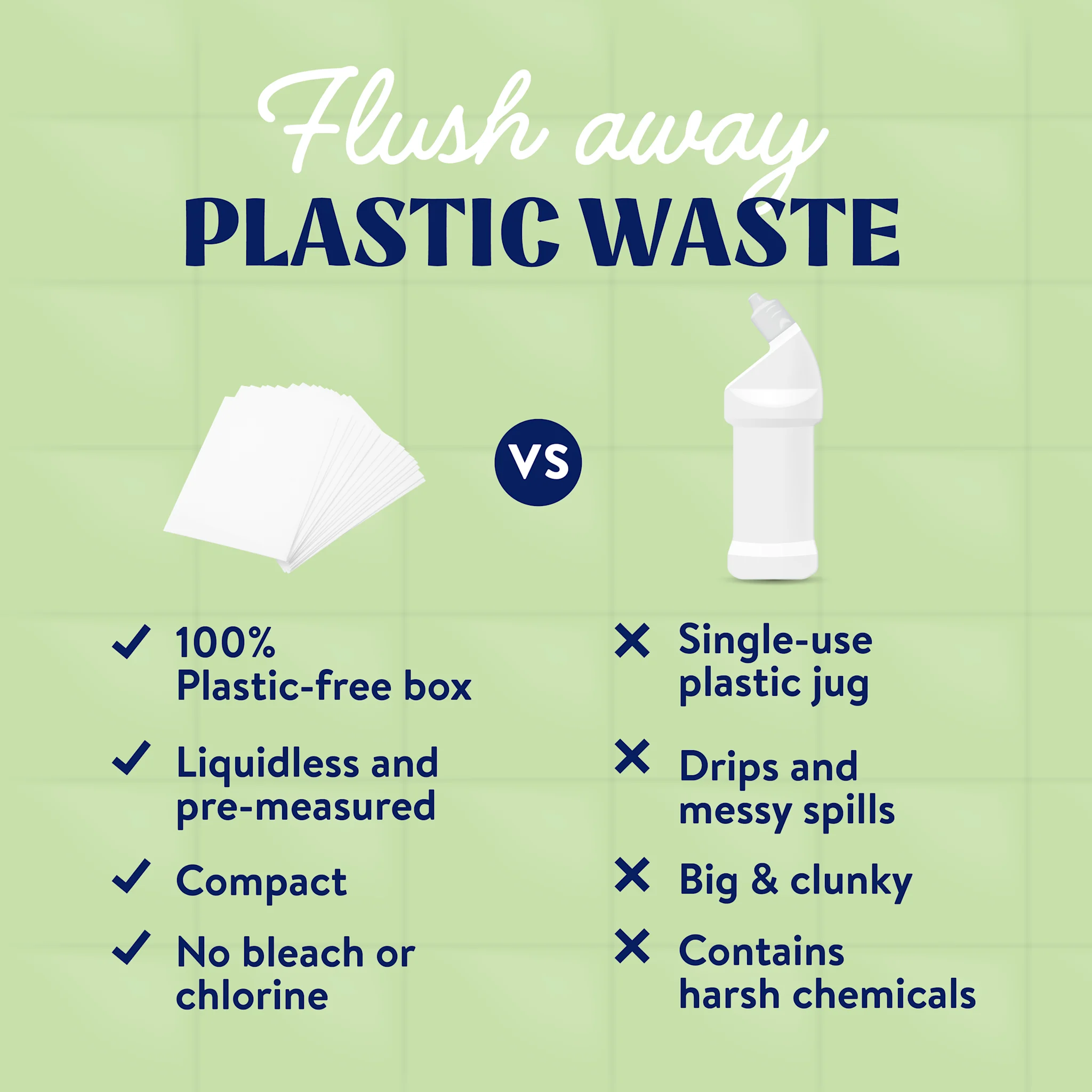 Simply drop a pre-measured sheet into the toilet bowl, wait for it to dissolve, brush with the sudsy water for a thorough clean, and flush away stains, rings, and odors. No splashing, no squirting, and no mess—just a sparkling clean bowl with minimal effort.